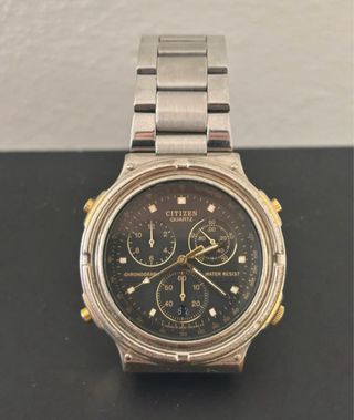 Orologio da polso Citizen con movimento al quarzo e funzione cronografo. - Cassa e bracciale in metallo. - Quadrante scuro con indici e lancette a contrasto. - Tre contatori sul quadrante. Circonferenza: 19cm / Diametro: 6,5cm / Larghezza maglie: 2cm / Lunghezza chiusura: 3,5cm / Diametro quadrante: 30-38mm / Profondità quadrante: 1cm