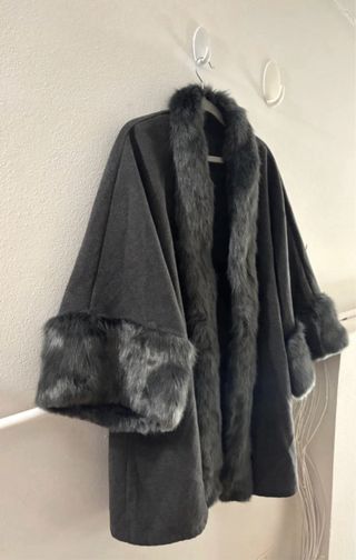Elegante mantella grigia con dettagli in pelliccia sintetica. Un capo versatile per aggiungere un tocco di stile. - Design a trapezio. - Maniche raglan. - Bordi in pelliccia sintetica su collo e polsini. Taglia: XL