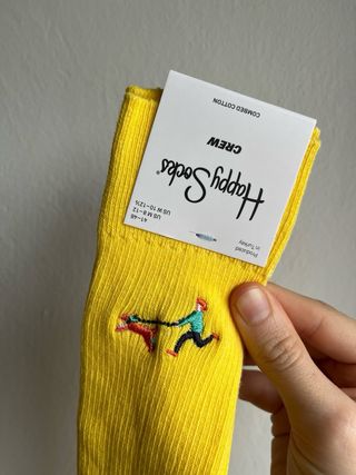 Calzini Happy Socks con un divertente disegno di una persona che porta a spasso un cane. Perfetti per aggiungere un tocco di allegria al tuo outfit. Taglia 41-46, mai utilizzati
