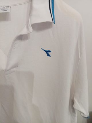 Maglietta polo Diadora da uomo, colore bianco. Presenta un design classico con colletto e dettagli a contrasto sulle maniche. non posso attestare che sia originale proviene da stok falimenti e non mi prendo resonsabilità - Logo Diadora ricamato sul petto. - Colletto con righe blu e nere. - Tessuto traspirante.