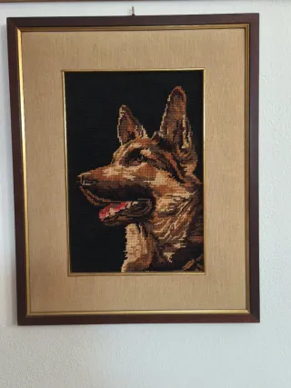 Bellissimo quadro raffigurante un cane pastore tedesco. - Realizzato a mano con tecnica a mezzo punto - Cornice in legno scuro con passpartout in tessuto. - Sfondo nero che esalta il soggetto. Misure cm 38x47,5