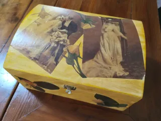 Elegante bauletto in legno con coperchio bombato, decorato artigianalmente con tecnica del decoupage. Un pezzo unico, ideale come portagioie, scatola dei ricordi, contenitore per lettere, fotografie o piccoli oggetti 📏 Misure: 26 × 19 × 14 cm 🎨 Decorazione: lavorazione manuale, stile romantico/shabby (come da foto) 📦 Condizioni: ottime, usato pochissimo