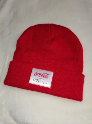 Berretto in maglia rossa con logo Coca-Cola. - Patch con logo Coca-Cola. - Simboli delle Olimpiadi e Paralimpiadi.