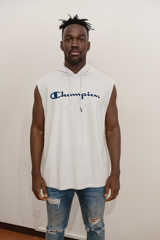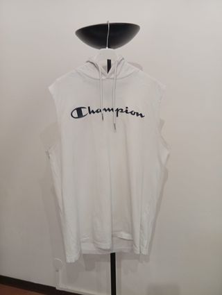 T-shirt con cappuccio e logo Champion. prodotto originale ottime condizioni - Senza manicheprodotti sterilizzati e lavati. Restiamo a disposizioni per eventuali domande per assistenza. Siamo rivenditori di merce nuova usata rigenerata abbigliamento accessori giocattoli e altro e vendiamo e spediamo in tutta Italia. Ci troviamo a Ravenna. ci teniamo a specificare che rigenerati non significa falsi, o riproduzione, significa capi ripristinati da eventuali piccoli danni. Ogni annuncio ha le sue specifiche (Nuovo-Usato-Rigenerato) - Cappuccio con laccetti - Logo Champion sul davanti