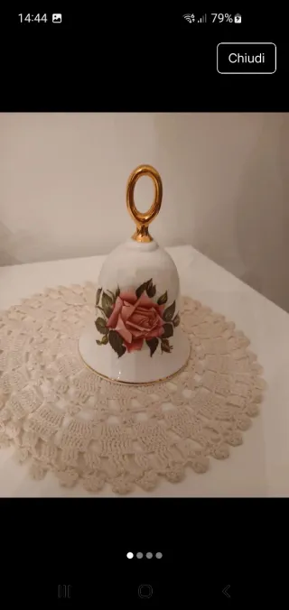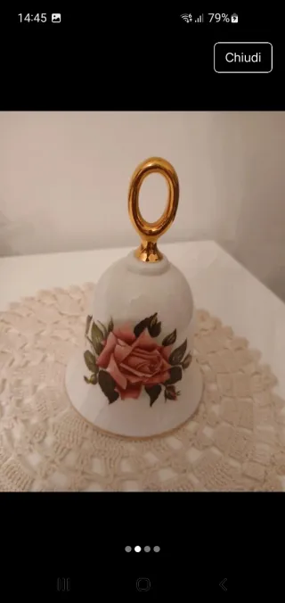 Deliziosa campanella in ceramica decorata con una rosa. - Finitura in oro sull'impugnatura. - Motivo floreale dipinto a mano.