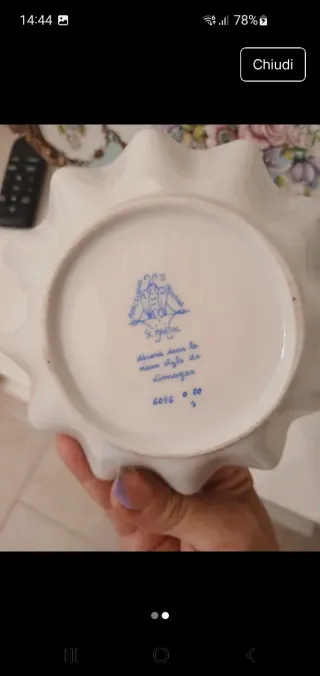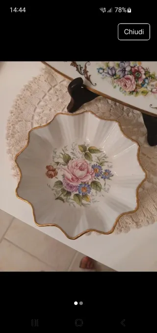 Elegante piattino svuotatasche Limoges con una splendida decorazione floreale. - Bordo dorato ondulato. - Motivo di rose e fiori blu. - Finitura in porcellana bianca.