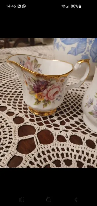 Set vintage composto da una tazza e una lattiera, entrambi con decorazioni floreali e dettagli dorati. - Tazza con bordo decorato. - Lattiera con manico e bordo dorati. - Design floreale colorato.