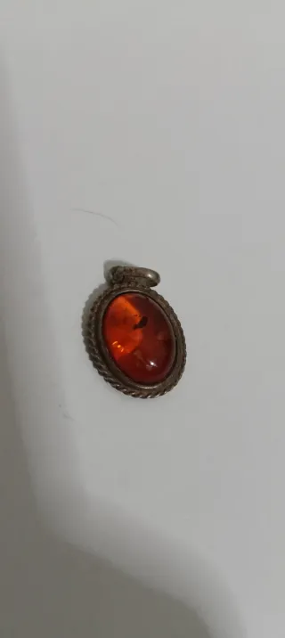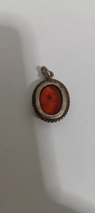 Elegante ciondolo con pietra d'ambra incastonata in argento 925. - Design ovale con cornice lavorata. - Dettaglio interno nella pietra d'ambra.