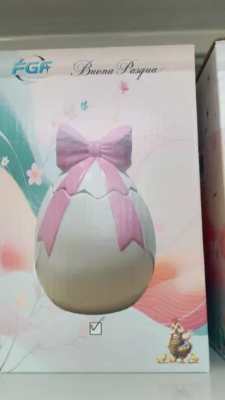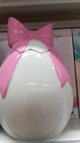 Barattolo a forma di uovo di Pasqua, decorato con un fiocco rosa. - Colore: bianco e rosa. - Materiale: ceramica. - Design a tema pasquale.
