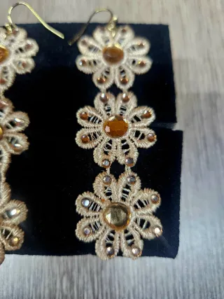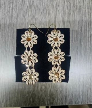 Delicati orecchini fatti a mano con un design floreale. - Finitura in pizzo beige. - Dettagli dorati al centro di ogni fiore. - Piccoli cristalli incastonati sui petali.