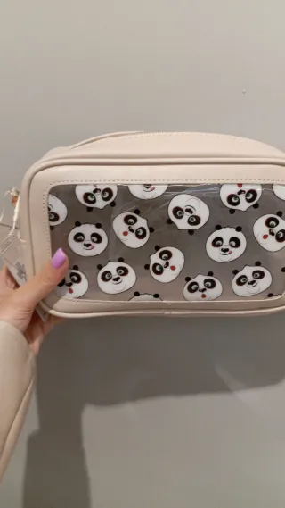 Borsa per il trucco con un divertente motivo di panda. La parte anteriore è trasparente per vedere facilmente il contenuto. - Design con simpatici panda. - Materiale resistente. - Chiusura con cerniera.