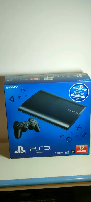 Consolle Sony PlayStation 3 Slim in colorazione nera, con 12GB di memoria (espandibile). - Ideale per giocare e guardare film su Blu-ray Disc. - Include un controller DualShock 3. La consolle è senza graffi o altro. Joystick ancora intonso, essendo stata usata pochissimo e poi lasciata in libreria.