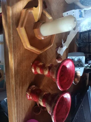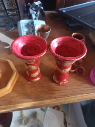 Eleganti porta candele che aggiungono un tocco di colore e stile alla tua casa. - Realizzati in terracotta e legno. - Finitura bicolore rosso e oro.