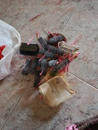 Lotto di accessori per capelli per creare boccoli. - Molti boccoli per capelli inclusi. - Alcuni accessori per capelli sono di colore oro e rosa.