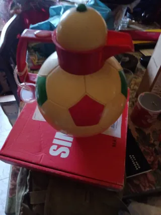 Brocca termos a forma di pallone da calcio, ideale per mantenere le bevande calde o fredde. - Design unico a tema sportivo. - Manico rosso per una presa comoda. - Tappo verde e beccuccio rosso.