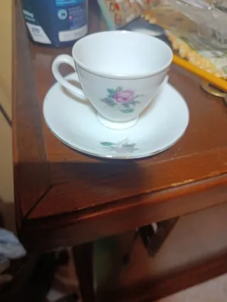 Set di 8 tazze con piattino in porcellana, perfette per aggiungere un tocco vintage alla tua tavola. - Design floreale con rosa. - Bordo dorato sottile.