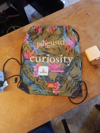 Zainetto con stampa floreale e logo Più Gusto. - Design con fiori tropicali e foglie. - Logo Più Gusto ben visibile. - Dettaglio San Carlo sul fondo.