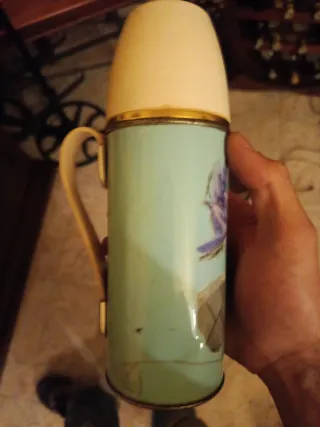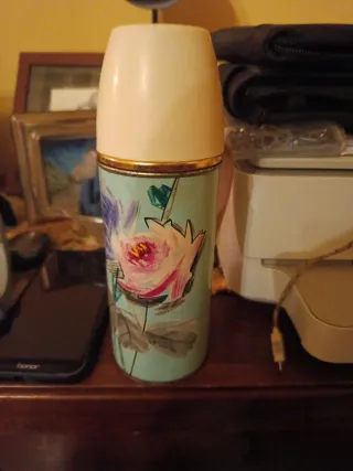 Thermos vintage con una decorazione floreale. Presenta un amacaturaa non ne compromette l'utilizzo - Design floreale su sfondo azzurro. - Dettaglio dorato tra il corpo e il tappo. - Tappo color crema.