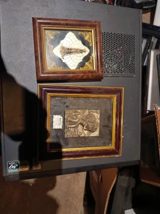 Due eleganti quadretti con cornice in legno, uno con dettagli in argento e oro e l'altro con un bassorilievo. - Cornice in legno scuro con finiture dorate. - Decorazioni interne in argento e oro. - Bassorilievo centrale in metallo.