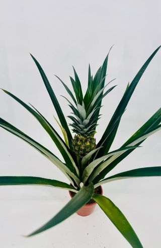 Pianta di ananas in vaso, con un piccolo frutto in crescita. - Foglie verdi lunghe e appuntite. - Vaso marrone incluso.