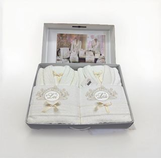 Elegante set da bagno da 8 pezzi, perfetto per aggiungere un tocco di lusso alla tua casa. - Include accappatoi e asciugamani finemente rifiniti. - Dettagli in pizzo e fiocchi decorativi. - Ricamo Lei e Lui sui tessuti. Taglie 48/52