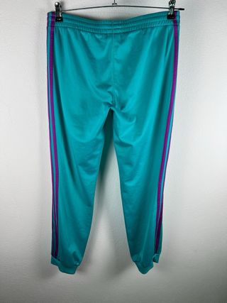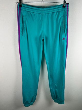 Pantaloni sportivi Adidas in un vivace color verde acqua con dettagli viola. - Design a tre strisce sui lati. - Vita elasticizzata con coulisse. - Tasche laterali. - Orlo elasticizzato alla caviglia.