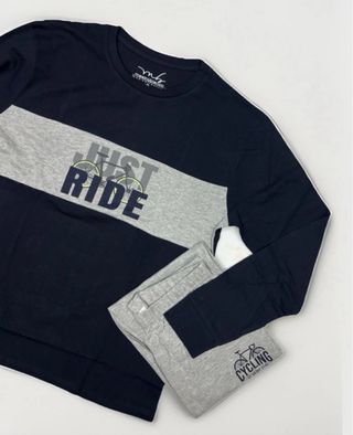 CONTATTACI PER LA SCELTA TAGLIA Pigiama sportivo da uomo, comodo e pratico. - Maglia a maniche lunghe con stampa JUST RIDE e dettaglio grigio. - Pantaloni lunghi grigi con stampa CYCLING. - Realizzato in 100% cotone per un comfort ottimale.