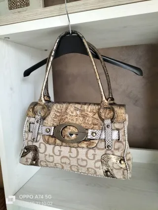Elegante borsa Guess con finiture in ecopelle effetto coccodrillo. - Logo Guess inciso sulla fibbia. - Dettagli in pitone. - Manici dorati. - Tessuto monogrammato.