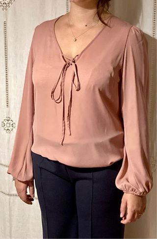 Elegante blusa Kocca color rosa cipria, perfetta per ogni occasione. - Maniche lunghe a sbuffo. - Scollo a V con laccetti. - Tessuto leggero e fluido.