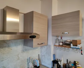 Cucina completa con finiture in legno tinta olmo naturale e acciaio inox - Mobili pensili e base. - Piano cottura a 4 fuochi in acciaio inox - Forno. - Lavastoviglie Indesit 10 coperti - Lavello acciaio inox - Cappa in acciaio inox Completa il tutto un ulteriore pensile da 60cm e tre mensole ad L
