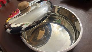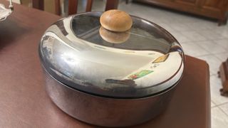 Elegante contenitore con coperchio, perfetto per conservare oggetti. - Materiale: metallo argentato lucido. - Coperchio con pomello in legno.