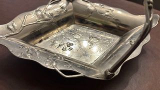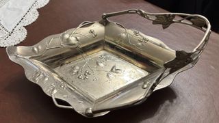 Elegante centrotavola in metallo argentato, con un design raffinato. - Decorazioni floreali e a bacche. - Manico per un facile trasporto. - Bordo sagomato.