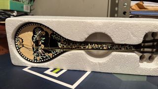 Carillon decorativo a forma di mandolino. - Struttura in legno scuro con intarsi floreali. - Corde dorate decorative.