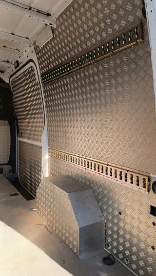 Pannellatura interna in alluminio per furgone Mercedes sprinter o Volkswagen crafter dal 2006 al 2018. Asta a molla per bloccaggio merce e barre forate per cinghie di fissaggio