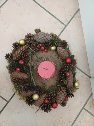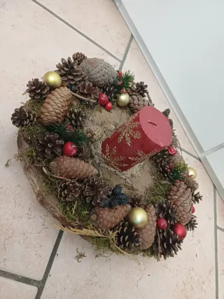 Bellissimo centrotavola per le feste, perfetto per decorare la tua casa durante il periodo natalizio. Realizzato con elementi naturali e una candela decorativa. - Decorazioni con pigne e bacche rosse. - Candela rossa centrale con dettagli dorati. - Base in legno grezzo.