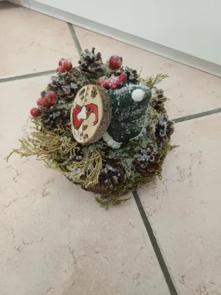 Un grazioso centrotavola per le feste, perfetto per aggiungere un tocco natalizio alla tua casa. - Decorato con pigne e bacche rosse. - Cappello da elfo verde con pompon bianco. - Elemento decorativo in legno con disegno di gnomo.
