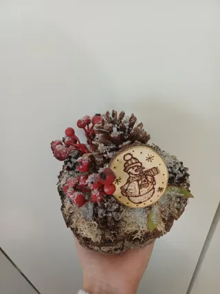 Un grazioso centrotavola a tema natalizio, perfetto per decorare la tua casa durante le feste. - Realizzato con pigne e bacche. - Base in sughero e legno. - Decorazione con pupazzo di neve intagliato.