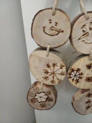 Set di decorazioni natalizie realizzate in legno, perfette per aggiungere un tocco rustico e festivo alla tua casa. - Due pupazzi di neve con facce sorridenti. - Fiocchi di neve intagliati su dischi di legno. - Realizzate con tecnica pirografica.