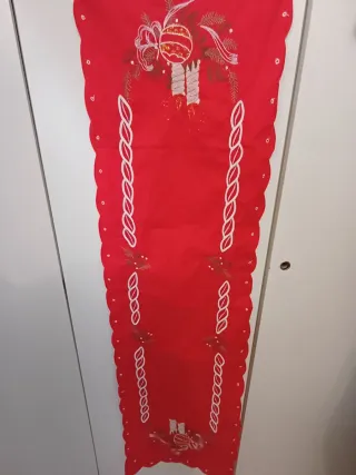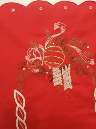 Elegante runner da tavola per le festività natalizie, con un design festoso. - Colore rosso vivace. - Ricami dorati e bianchi con dettagli natalizi. - Bordo smerlato decorativo.