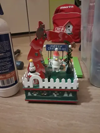 Carillon a tema natalizio con simpatici pupazzi di neve e decorazioni festive. - Base decorata con pupazzi di neve e alberi. - Figure in legno dipinte - Segnale Merry Christmas.