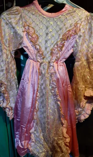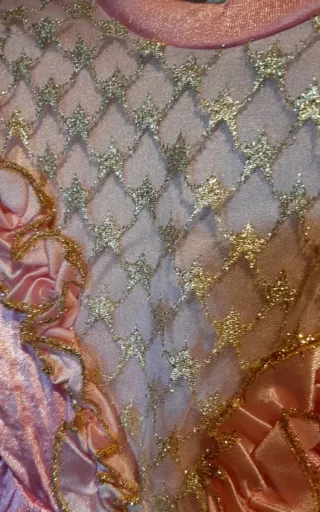 Bellissimo vestito di carnevale rosa con dettagli dorati. - Tessuto satinato rosa. - Maniche lunghe con rete e stelle dorate. - Volant decorativi lungo il corpetto e sui polsini.