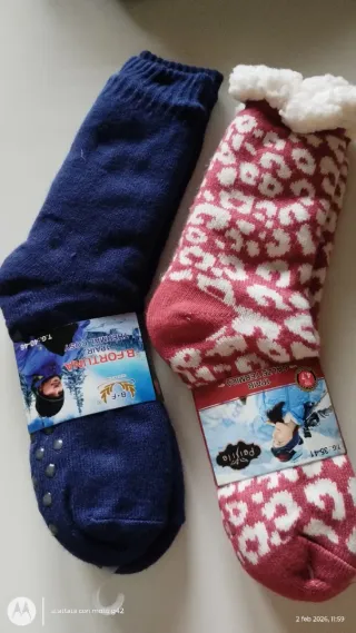 Coppia di calze antiscivolo, perfette per stare comodi in casa. Una è blu con puntini antiscivolo sul fondo, l'altra è rosa con fantasia leopardata e bordo in pelliccia sintetica. - Calze antiscivolo B.FORTUNA - Taglia 1: 40-48 - Taglia 2: 35-41 - Una blu con puntini antiscivolo - Una rosa con fantasia leopardata e bordo in pelliccia sintetica