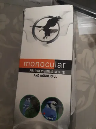 Monocolo con un design ispirato alla natura, raffigurante un'aquila in volo e due uccelli. - FIELD OF VISION IS INFINITE AND WONDERFUL scritto sulla confezione. - Immagini di un'aquila e di due uccelli stilizzati.