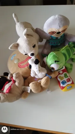 Peluche assortiti: cane, bradipo, lucertola, bisco