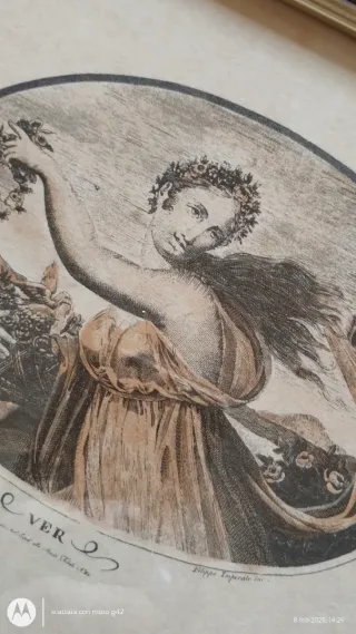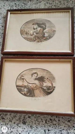 Bellissima coppia di stampe antiche, raffiguranti i mesi Hiems e Ver. - Cornice in legno scuro. - Incisioni ovali. - Dettagli curati.