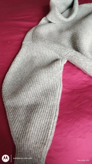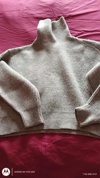 Maglione grigio con collo alto, a coste con spalle cadenti maniche larghe e polsini perfetto per le giornate più fresche. Misure in foto - Tessuto morbido e caldo. - Design a coste. - Maniche lunghe.