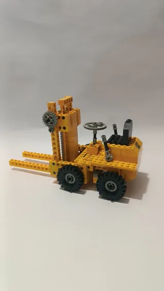 Modello Lego Technic 850, un carrello elevatore. - Costruzione in mattoncini gialli. - Dettagli meccanici visibili. Completo senza scatola e istruzioni. Alcuni pezzi presentano segni di usura, crepe o ingiallimento.