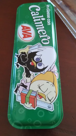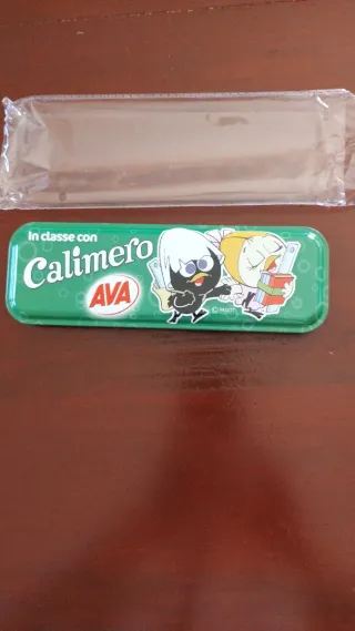 Astuccio vintage con i personaggi di Calimero e AVA. - Design colorato su sfondo verde. - Illustrazioni dei personaggi. - Marchio AVA presente.