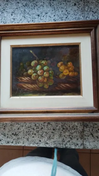 Dipinto a olio raffigurante un cesto di uva. - Cornice in legno dorato. - Soggetto: natura morta con frutta. Autore Giorgio Tosi
