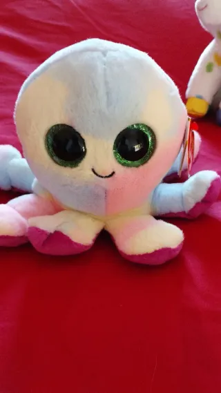 Set di due peluche della collezione Ty Beanie Boos. - Un polpo color arcobaleno con dettagli in rosa e blu. - Un unicorno bianco con macchie colorate e dettagli arcobaleno.